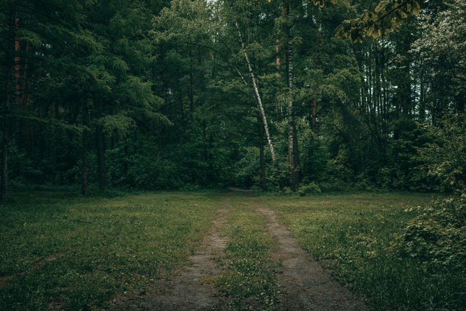 Forest Nature – A tranquil unpaved pathway leads through a dense #12335112